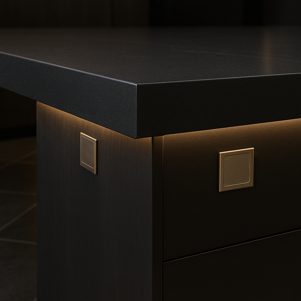 - Плоскости без швов. Фартук и столешницы — крупноформатный камень/керамогранит с honed-фактурой.