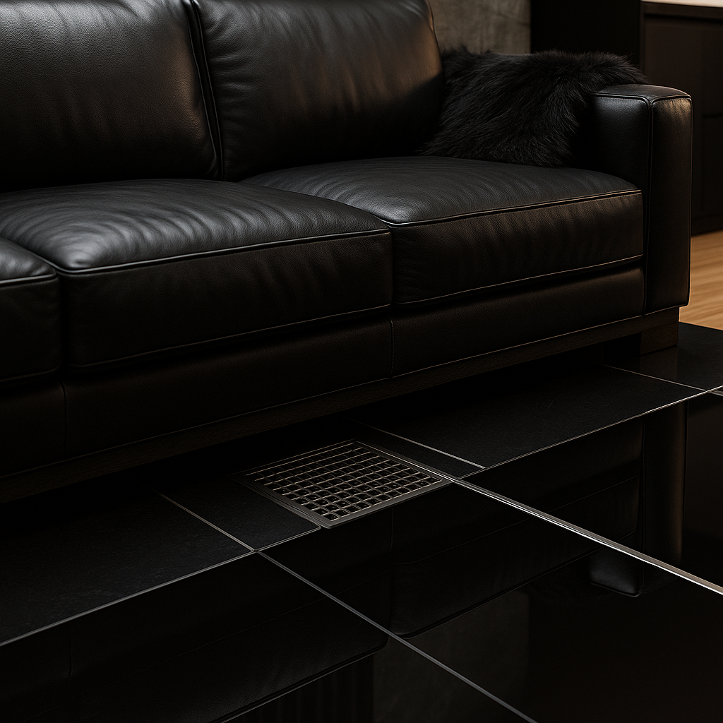 - Инженерия в кадре не видна. Линейные решётки пола и скрытые приточно-вытяжные каналы.